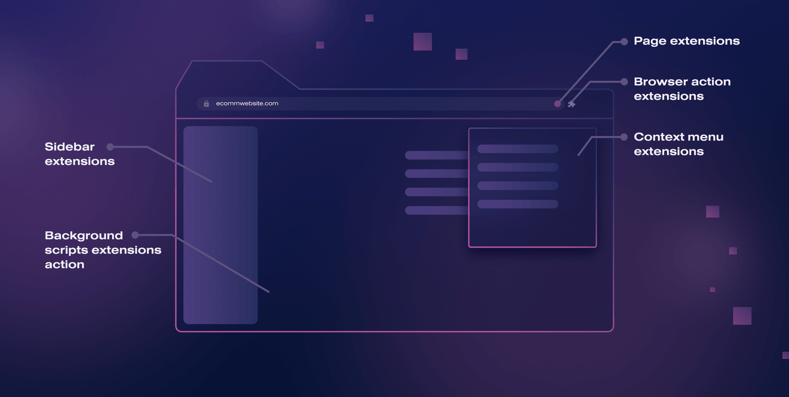 Page extensions modify or enhance the functionality of a specific web page or a set of web pages. These extensions typically interact with the content and elements of the page. Examples of page extensions include Adblock Plus, Honey, and Web Scraper.