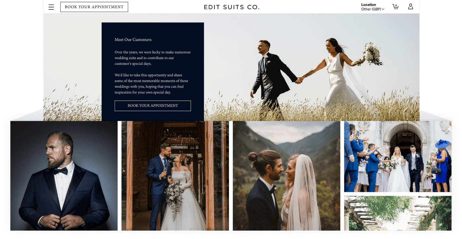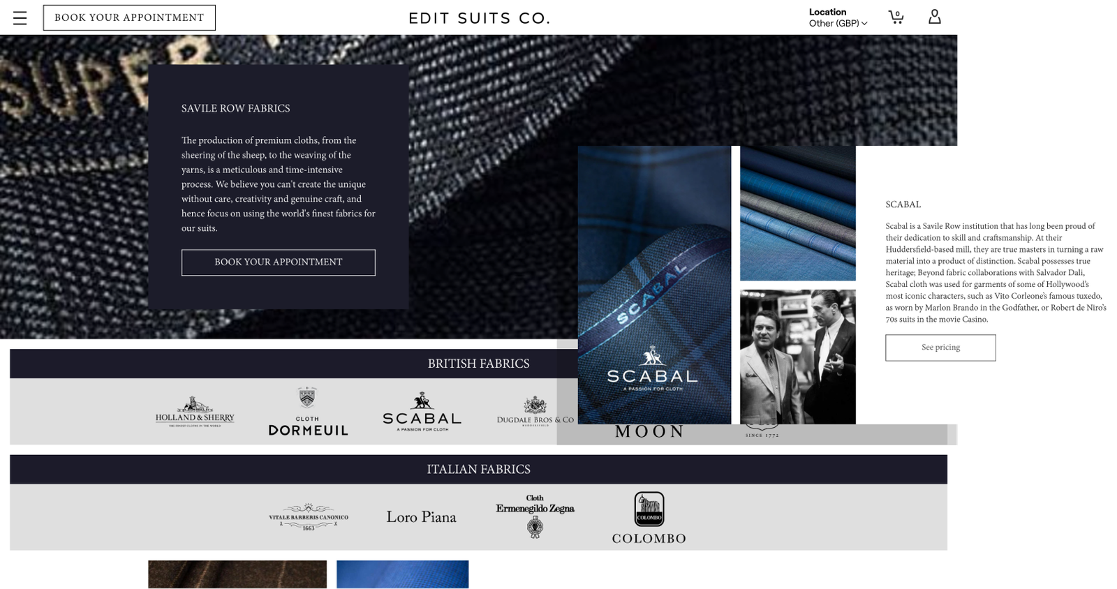Edit Suits is a company of men’s business clothing. Its mission is to create the most comfortable customized men’s business suits. Edit Suits Co. shops are located in several cities in England and Singapore. Their website consists of three elements: an online store, a booking system, and a CRM system.